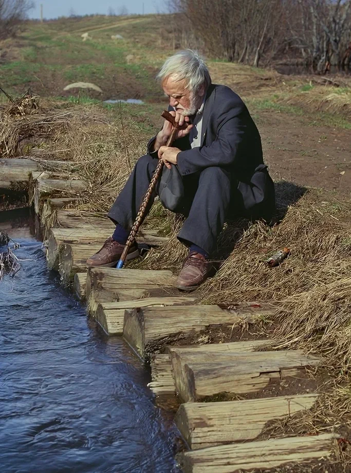 «Я предложил Макарычу для эпической панорамы сидеть на земле в чёрной рубахе, а я, снимая широкоугольной оптикой, отъезжал бы от него. Горизонт за спиной выгнется, Иван в тёмной рубахе потеряется на земле, а камера медленно уйдёт на круговой обзор далей. На бугре Макарыч вслух обсуждал предложенное: