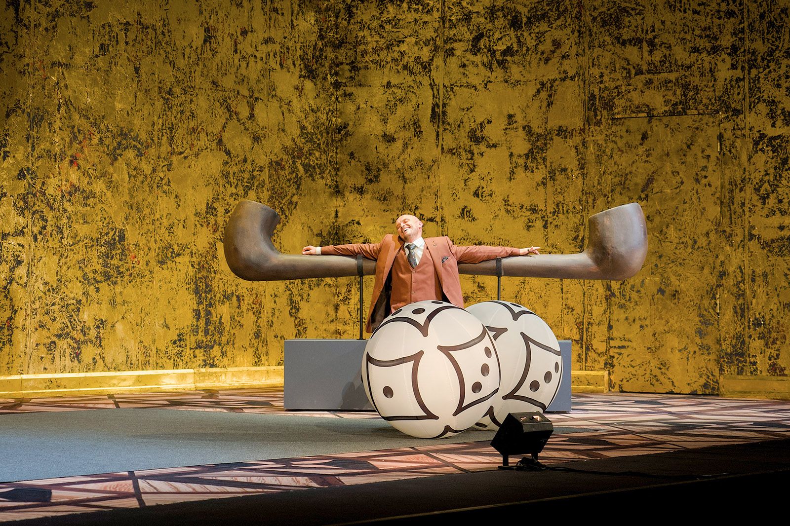 Перед нами – пустая сцена, вернее авансцена, выделенный клочок пространства (какой-то неправильной, как будто трапецевидной формы). Дальше – только стена до неба, выкрашенная вызывающе золотой краской. Причём выкрашенная как-то по свойски, как будто «накатом». Это тесный мир, в котором живут герои азаровского «Маскарада». Кто-то мечется, как по золотой клетке (прежде всего, это Арбенин Василия Уриевского). Кто-то обживает и завоевывает этот мирок (Казарин, в исполнении Анатолия Григорьева). А кто-то кажется ангелом, случайно попавшим в эту теснину (Нина – Евгения Мугайских).