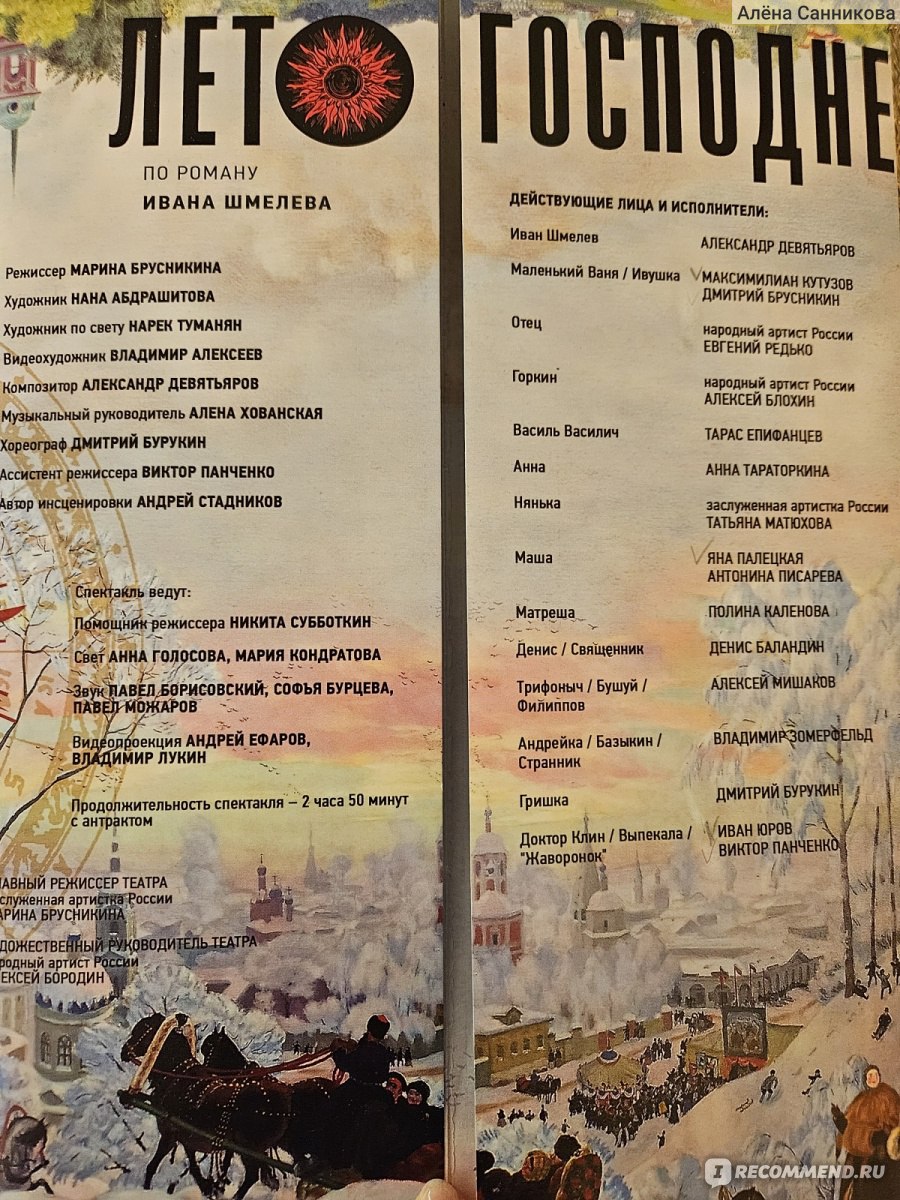 Особо отмечу яркую, красочную и очень познавательную программку к спектаклю – полноценный буклет, в котором рассказывается и об Иване Шмелеве, но главное – о православных праздниках, упоминаемых в спектакле. Редкий случай, когда хочется программку перечитывать и после театра!