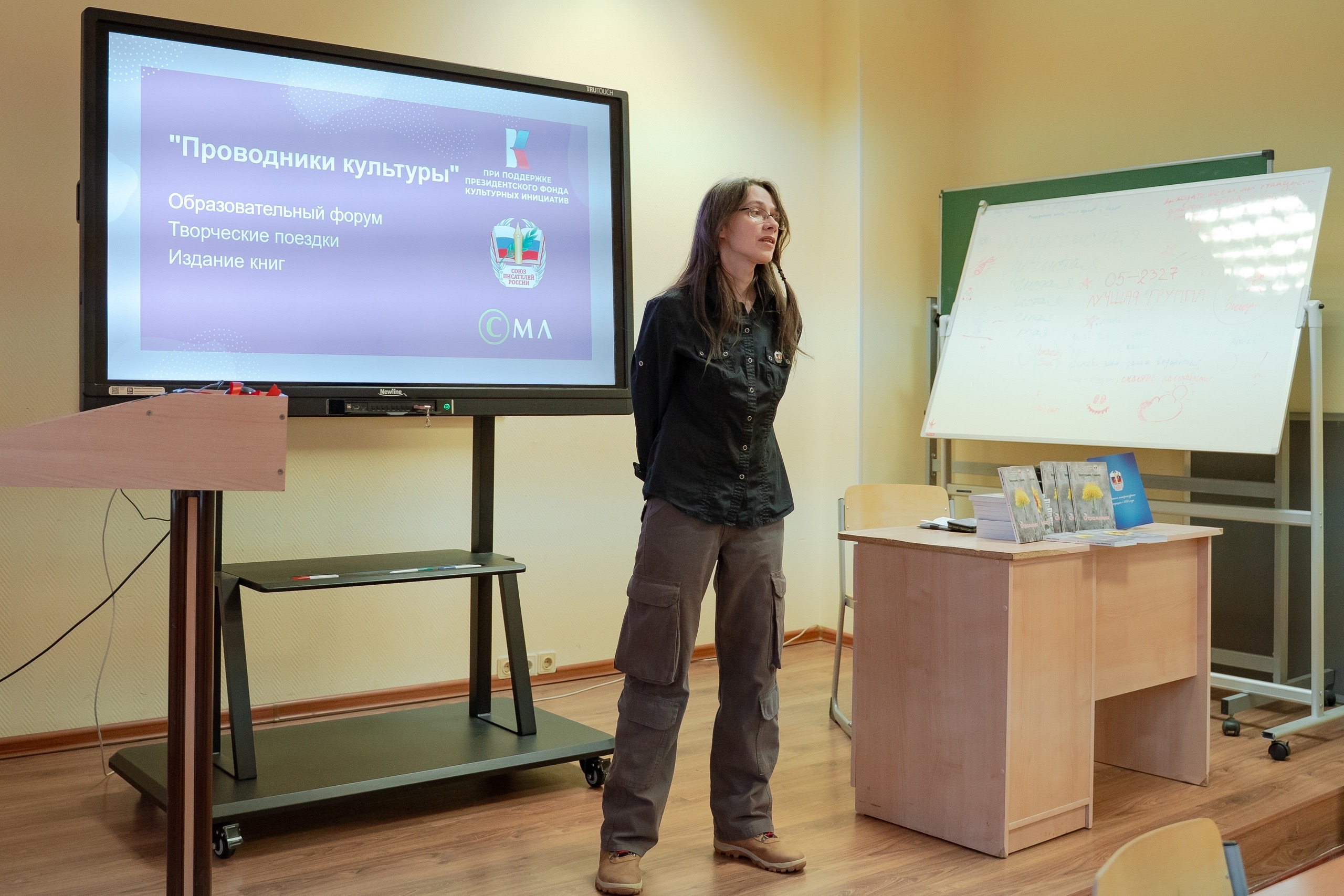 На встрече были представлены книги, изданные в рамках проекта: сборник «Проводники культуры. Наше время», книга Павла Пушкина «Навек основана милость», книга-перевёртыш «Отражения» Екатерины Годвер и «Неисправность» Дарьи Пиотровской. Отдельное внимание Екатерина уделила поездке в ДНР и ЛНР. Она показала фотографии, рассказала о Торезе — небольшом шахтёрском городе, о встречах с ветеранами ополчения и о том, что, несмотря на разговоры о войне, там продолжается обычная жизнь.